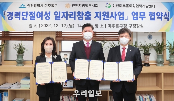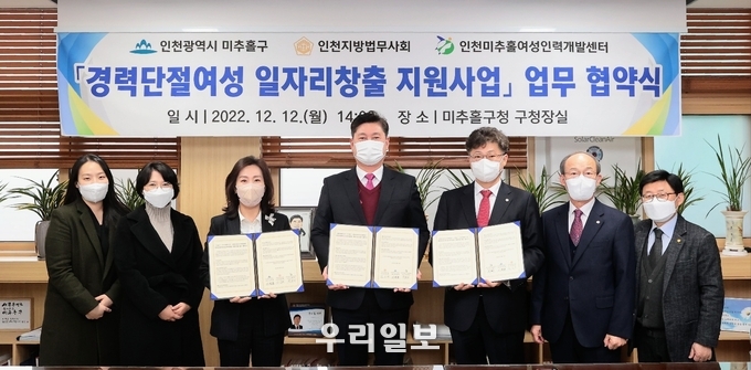 인천 미추홀구는 12일 정종현 인천지방법무사회장과 심혜미 인천미추홀여성인력개발센터 관장이 참석한 가운데 경력단절여성 일자리창출 지원사업의 효율적 추진을 위한 3자 업무협약을 체결했다.