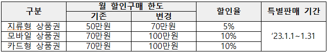 아울러 1인당 월 구매한도 역시 지류는 기존 50만원에서 70만원으로, 카드 및 모바일은 70만원에서 100만원으로 상향된다.