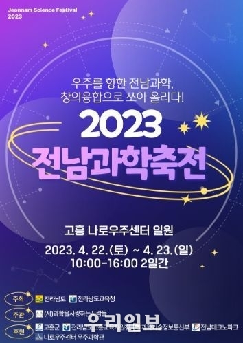전라남도교육청은 오는 4월 22일~23일 이틀 간 고흥 나로우주센터 일원에서 ‘우주를 향한 전남과학, 창의융합으로 쏘아 올리다’라는 주제로 전남과학축전을 개최한다고 밝혔다.