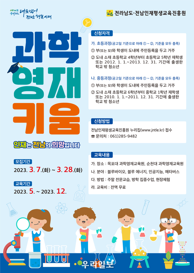 전라남도는 지역 전문기관 시설을 활용해 과학에 재능 있는 학생에게 체계적 전문교육을 무료로 지원하는 ‘2023년 과학영재키움’ 참가자를 모집한다.