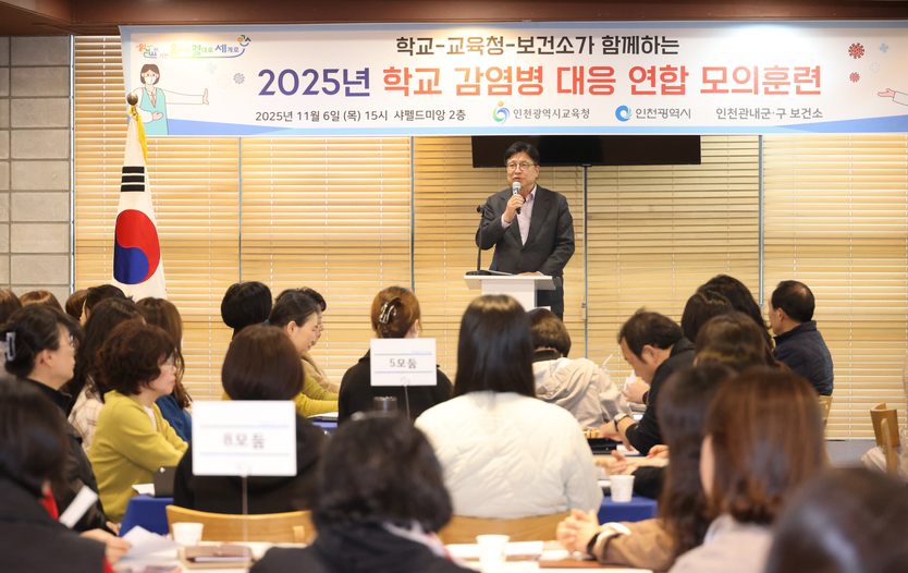【우리일보 이은영 기자】 인천시교육청이 6일, 시·군·구 보건소 역학조사관, 감염병 전문가, 학교 감염병 관리조직 등 100여 명이 참여한 ‘학교 감염병 대응 연합 모의훈련’을 실시했다.
