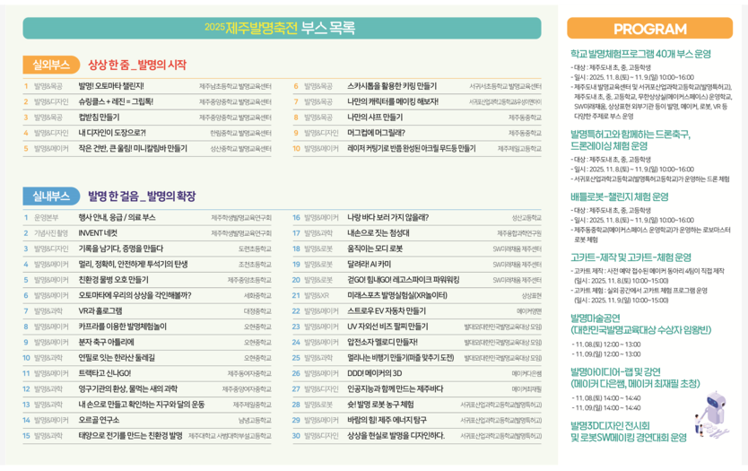 행사장에는 도내 40개 학교가 참여하는 발명체험 부스가 마련되어 배틀로봇 대결, 드론 축구 및 드론 경주, 고카트 만들기 체험, 메이커 강연, 발명 마술 공연 등 학생들이 즐길 수 있는 다양한 발명·과학 체험 프로그램이 운영된다.