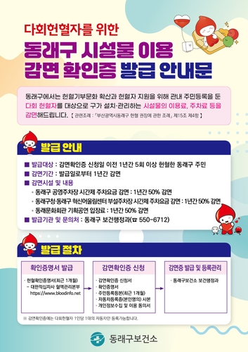 대상자는 대한적십자사 혈액관리본부 누리집에서 발급되는 헌혈 확인 증명서와 주민등록등본, 자동차등록증 등 관련 서류를 지참해 동래구 보건소를 방문하면 시설물 이용 감면 확인증을 발급받을 수 있다.