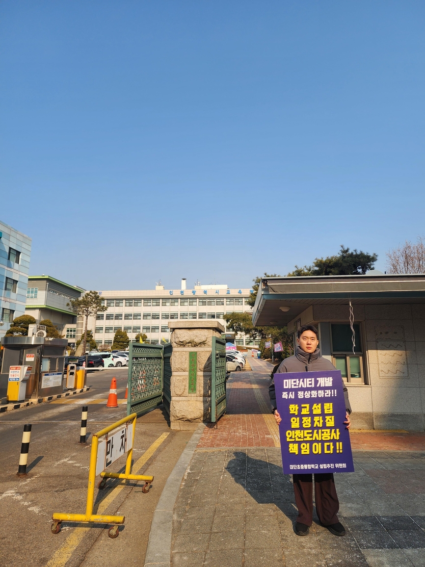 한 의원은 22일 인천도시공사와 인천시교육청 앞에서 1인 피켓 시위를 진행하고, 미단시티 개발 정상화와 통합학교 조기 착공을 강하게 요구했다.