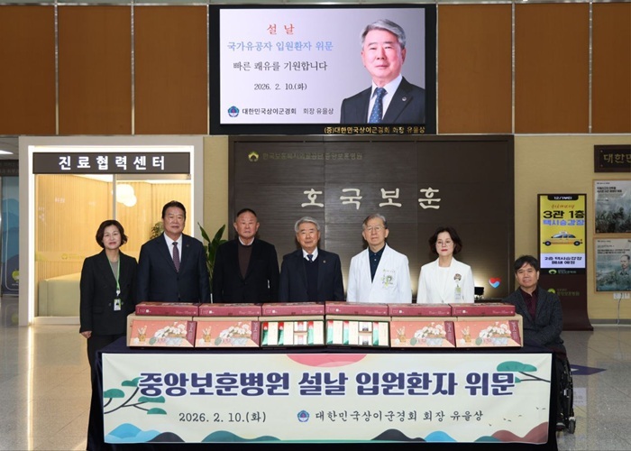 【우리일보 김은기 기자】 대한민국상이군경회 유을상 회장은 2026년 2월 10일(화) 11:00 민족의 대명절 설날을 맞이하여 서울중앙보훈병원을 찾아 조국을 위해 희생하여 상이를 입고 입원 중인 국가유공자분들에게 빠른 쾌유를 기원하며 감사의 마음을 담아 위문품을 전달했다.