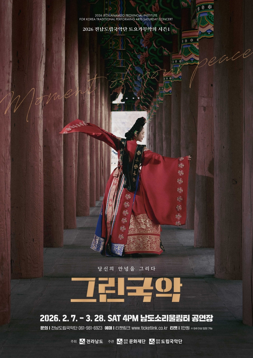 전남도립국악단은 14일을 포함해 매주 토요일 남도소리울림터에서 ‘토요 가무악희 그린국악’ 공연을 이어가며 명절 분위기를 돋운다. 순천 오천그린광장과 드라마촬영장에서는 14~18일 각각 설맞이 행사를진행한다.
