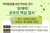 【우리일보 노연숙 기자】 제주특별자치도교육청(교육감 김광수)은 오는 23일 학생문화원 대극장에서 초등학교 보호자 150명을 대상으로 학력 향상 지원을 위한 문해력 영역 연수를 운영한다. 이번 연수는 보호자의 학력 향상에 대한 관심을 높이고 가정에서 자녀의 학습을 효과적으로 지원할 수 있는 구체적인 방법을 제공하기 위해 마련됐다. 강연에는 초등학교 교사로 20년간 재직하며‘공부머리를 키우는 공부법’,‘문해력 수업’등을 집필한 전병규 교사(필명: 콩나물쌤)가‘문해력, 공부의 핵심열쇠’를 주제로 강의를 진행한다. 강의에서는 문해력 부족의 진짜 의미, 초등 국어 실력이 수능까지 이어지는 이유, 독해가 어려운 네 가지 원인 등 자녀 학습에 직접적인 영향을 미치는 핵심 내용을 다룰 예정이다. 특히 이번 연수는 문해력 향상 방법과 효과적인 교육 전략을 보호자에게 안내하는 자리로 자녀의 자기주도적 학습을 돕는 실천적 지침을 제공할 것으로 기대된다. 이번 강연은 이 시대에 꼭 필요한 문해력 향상 방법과 효과적인 교육 방법을 보호자에게 안내하는 자리로 오는 26일까지 온라인(https://ksurv.kr/akM3Ojg-NzY)을 통해 사전 신청 후 참여할 수 있다.