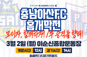 【우리일보 충남=한선희 기자】충남아산프로축구단(구단주 오세현, 이하 충남아산FC)이 2026시즌의 화려한 막을 올린다. 이번 홈 개막전은 역대급 경품과 화려한 초청 공연을 앞세워 축구 팬들의 기대를 한 몸에 받고 있다. 충남아산FC는 오는 3월 2일 오후 2시 아산 이순신종합운동장에서 파주프런티어FC를 상대로 ‘하나은행 K리그2 2026’ 1라운드 홈 개막전을 치른다고 밝혔다. 이번 경기는 임관식 감독 부임 이후 치러지는 첫 공식전으로, 새롭게 정비된 팀 컬러를 확인할 수 있는 중요한 무대다. 시즌의 시작을 알리는 뜻깊은 자리인 만큼, 오세현 구단주와 김태흠 충남도지사가 직접 시축에 나서 충남아산FC의 승리를 기원하고 2026시즌의 힘찬 출발을 선언할 예정이다. 홈 개막전의 가장 큰 화제는 단연 경품 이벤트다. 충남아산FC는 이날 추첨을 통해 캐스퍼 자동차 2대를 비롯해 세탁기, 냉장고, TV, 스타일러 등 고가의 최신 가전제품을 팬들에게 증정한다. 입장 시 제공되는 응모권을 통해 누구나 행운의 주인공이 될 수 있다. 경기장 밖 광장에서도 축제 분위기는 이어진다. 푸드트럭과 무료 커피차가 운영되어 경기장을 찾은 팬들에게 풍성한 먹거리를 제공하며, 온 가족이