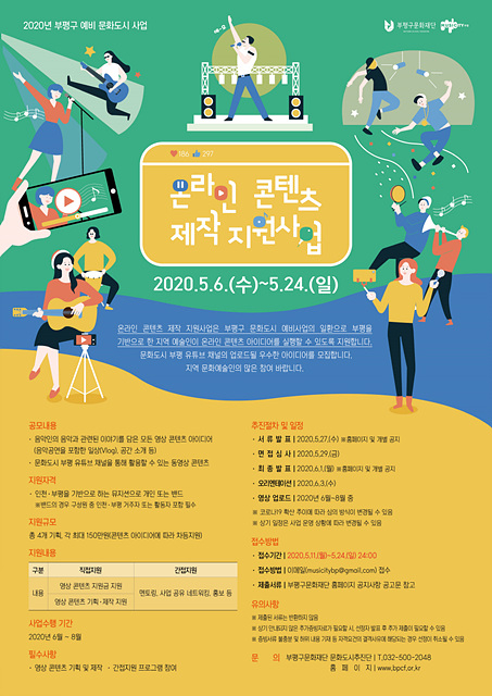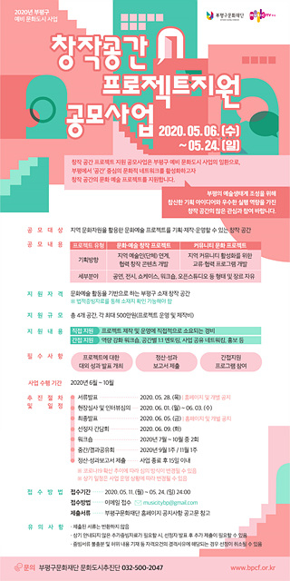 인천 부평구문화재단은 코로나-19로 위축된 부평구의 문화예술계를 위해 부평구에서 활동중인 시민, 예술가, 창작 공간을 대상으로 5월 6일부터 24일까지 ‘시민기획단 부평뮤즈’, ‘온라인 콘텐츠 제작 지원사업’, ‘창작 공간 프로젝트 공모사업’의 참여자를 모집한다.