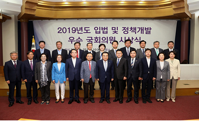 문희상 국회의장은 22일‘2019년도 입법 및 정책개발 우수 국회의원’시상식을 갖고 최우수 국회의원 6명과 우수 국회의원 36명에게 각각 상패를 수여했다.