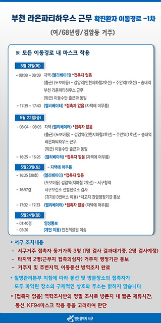 부천 라온파티하우스 뷔페관련 확진환자가 다수 발생하는 상황에서 A씨는 증상은 없었으나 회사 안내에 따라, 23일 오후 5시경 서구보건소를 방문해 검체채취를 진행했으며, 24일 새벽 1시 40분경 코로나19 확진판정을 받았다.