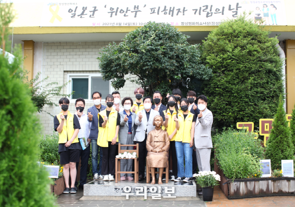 장성군이 일본군 위안부 피해자 기림의 날을 맞이해 14일 장성역 ‘평화의 소녀상’앞에서 헌화 등 추모 행사를 열었다. 장성군청년회의소, 장성군청소년상담복지센터 주관으로 개최된 이날 행사에는 유두석 장성군수, 김미순 군의원을 비롯해 장성군청년회의소 회원, 청소년 동아리 ‘소·나·무(소중한 너를 향한 나의 무한한 사랑)’회원 등이 참석해 위안부 피해자를 기리고 그 의미를 다시 한번 되새기는 시간을 가졌다.
