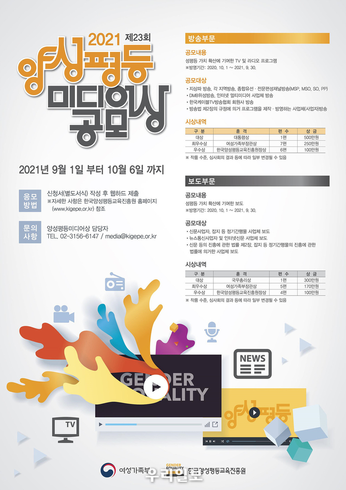 공모 대상은 양성평등 실천과 의식 향상에 기여한 ▲방송(TV, 라디오), ▲보도(신문, 인터넷 신문, 잡지 등 간행물 포함) 두 가지 부문으로, 방영·보도기간이 2020년 10월 1일부터 2021년 9월 30일 사이에 해당되는 작품이다.