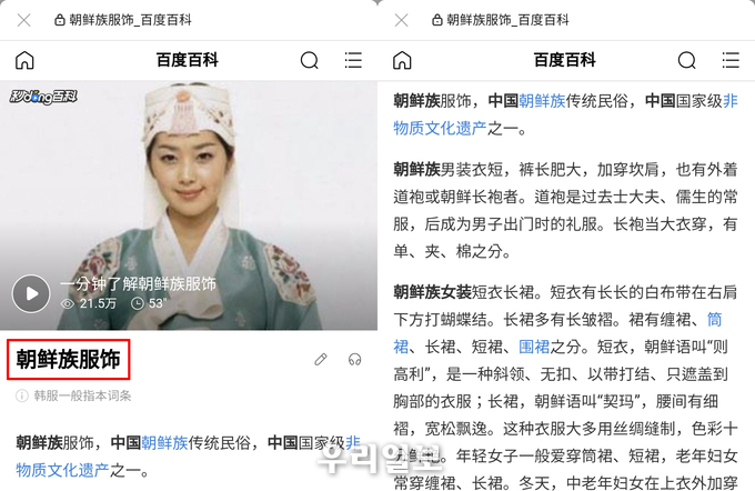 최근 중국 최대 포털사이트 바이두 백과사전에서 '한복'을 '조선족 복식'으로 소개하고, '한복'은 '한푸'에서 기원했다는 잘못된 사실도 기록한 것이 밝혀져 큰 논란이 됐다.