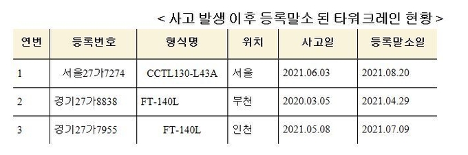 특히 부적합 타워크레인 중 3대는 사고가 발생한 이후에서야 등록이 말소되기도 했다. 등록번호 서울27가7274 크레인은 2021년 6월 3일 사고 발생, 8월 20일 등록말소, 등록번호 경기27가8838 크레인은 3월 5일 사고 발생, 4월 29일 등록말소, 등록번호 경기27가7955 크레인은 5월 8일 사고 발생, 7월 9일 등록말소 되었다. 즉 등록말소가 빨리 이루어졌다면 예방할 수 있는 사고였다.