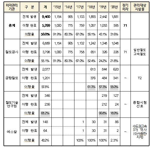 기관별로는 철도공사가 55.1%, 공항철도가 57.8%, 철도기술연구원 68.2%, 에스알이 43.2%를 나타내고 있다. 특히 철도공사의 경우 하자책임기간이 종료되었지만 아직도 미조치된 하자가 일반철도 36건, 고속철도 35건으로 총 71건에 달했다.