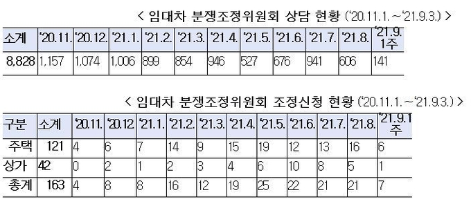이 중 한국부동산원 6개소의 2020년 11.1~2021.9월 3일까지의 임대차 분쟁조정위원회 상담 실적은 총 8,828건이다. 반면 조정신청건수는 주택 121건, 상가 42건으로 163건에 불과해 상담건수의 1.8%에 그쳤다.