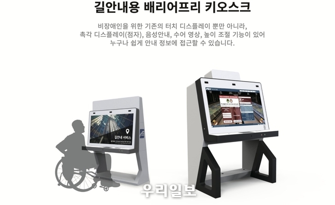 배리어프리 키오스크는 비장애인과 장애인 모두가 편하게 사용할 수 있도록 설계된 사용자 맞춤 키오스크이다. 센서로 어린아이와 휠체어 사용자 눈높이를 인식해 자동으로 높낮이가 조절된다. 시각장애인을 위한 키패드 및 촉각 디스플레이가 있을 뿐만 아니라, 영어를 포함한 다양한 언어로 음성지원이 가능하다.