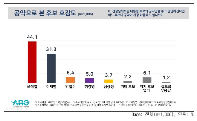 이번 여론조사 결과는 지난 10월 29일 아시아리서치앤컨설팅이 지난 28일 전국 18세 이상 남녀 1063명을 대상으로 대선후보의 경쟁력을 조사한 결과인 2.2%를 훨씬 상회하는 것이고 기존 군소 정치인들의 지지율을 뛰어넘는 것이다.