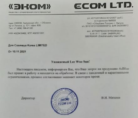 이에 러시아 정부는 러시아 내 최대의 요소수 생산업체인 에콤과 SIA를 통해 국제어린이올림픽 한국위원회 위원장인 이우선 회장의 한국 법인인 이티코스메야코리아를 통해 월 3만톤의 요소수를 국제 기준가격 수준에서 지속적으로 독점 공급하기로 결정하고 상호 간 계약을 체결하였다.