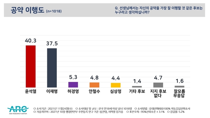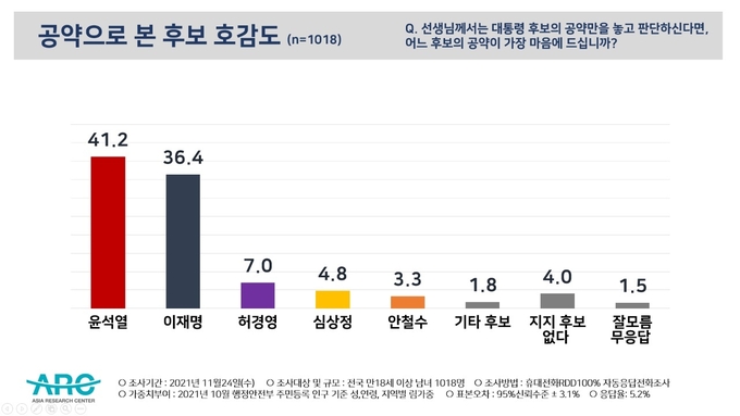 대선 공약으로 본 호감도 조사에서도 윤석열 후보 41.2%, 이재명 후보 36.4%로 양강구도가 유지되고 있다. 뒤이어 허경영 7.0%, 심상정 4.8%, 안철수 3.3%로 집계된 것이다.대통령이 된다면 대선공약을 가장 잘 이행할 것 같은 후보를 묻는 질문에선 윤석열 40.3%, 이재명 37.5%, 허경영 5.3% 안철수 4.8% 심상정 4.4%로 나타났다.