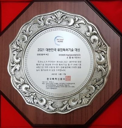이번 '제16회 2021 대한민국 유망특허기술 대상' 시상식은 올해 창간 16주년을 맞은 특허전문지 특허뉴스가 주최.주관하는 시상식으로 지난 12월 17일 충주 수안보 조선호텔 에메랄드룸에서 개최했다.
