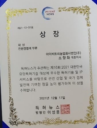 아이비트리농업회사법인(주) 소향화 대표이사가 제16회 2021대한민국 유망특허기술 대상 시상식에서 '친환경염색 부문 ' 대상을 지난 17일 수상 받았다.