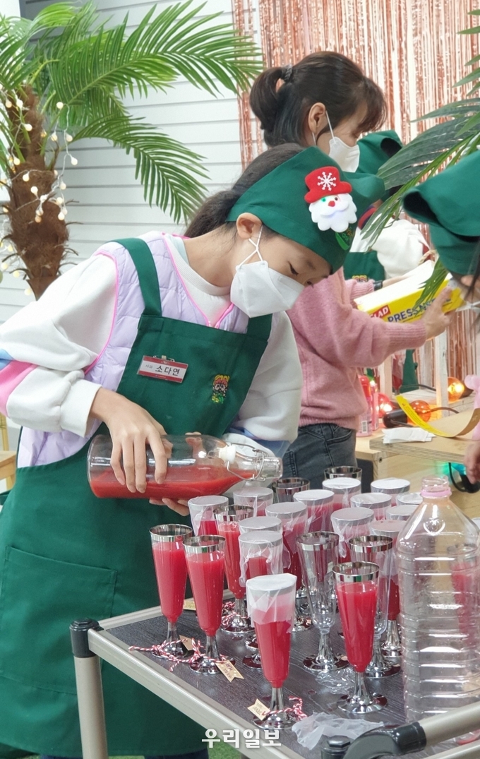 기존의 크리스마스 트리대신 딸기와 바질로 만든 딸기트리, 귤로 만든 선물 트리, 지역 농가에서 생산한 딸기로 만든 딸기우유, 크리스마스 건배용 음료로 만든 사과,당근,비트 착즙주스가 다회용 주스잔에 담겨 전시회를 관람한 학부모에게 큰 박수를 받았다.