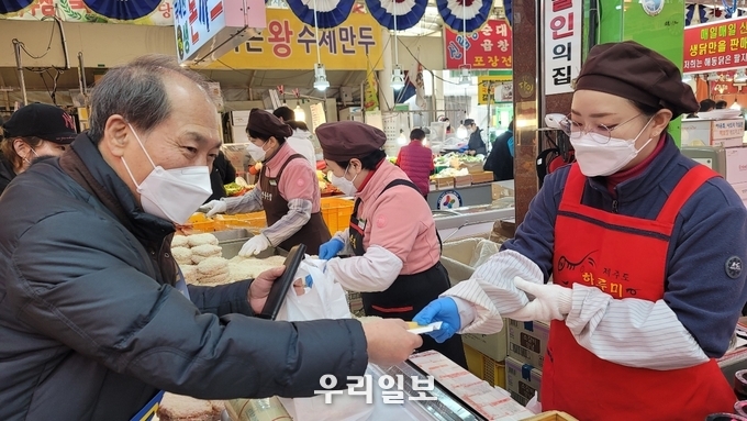 더불어민주당 이재명 대선후보 직속 기본사회위원회 인천 기본사회위원회가 23일 전국 광역위원회와 기초위원회가 동시에 참여하는 지역화폐 활성화 캠페인 ‘전통시장 앞으로 지역화폐 제대로’를 부평구 부평깡시장에서 진행했다.