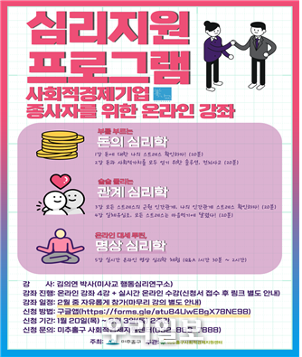 인천시 미추홀구(구청장 김정식)는 미추홀구사회적경제지원센터 주관으로 사회적경제기업 종사자 대상 온라인 심리지원 프로그램을 실시한다.