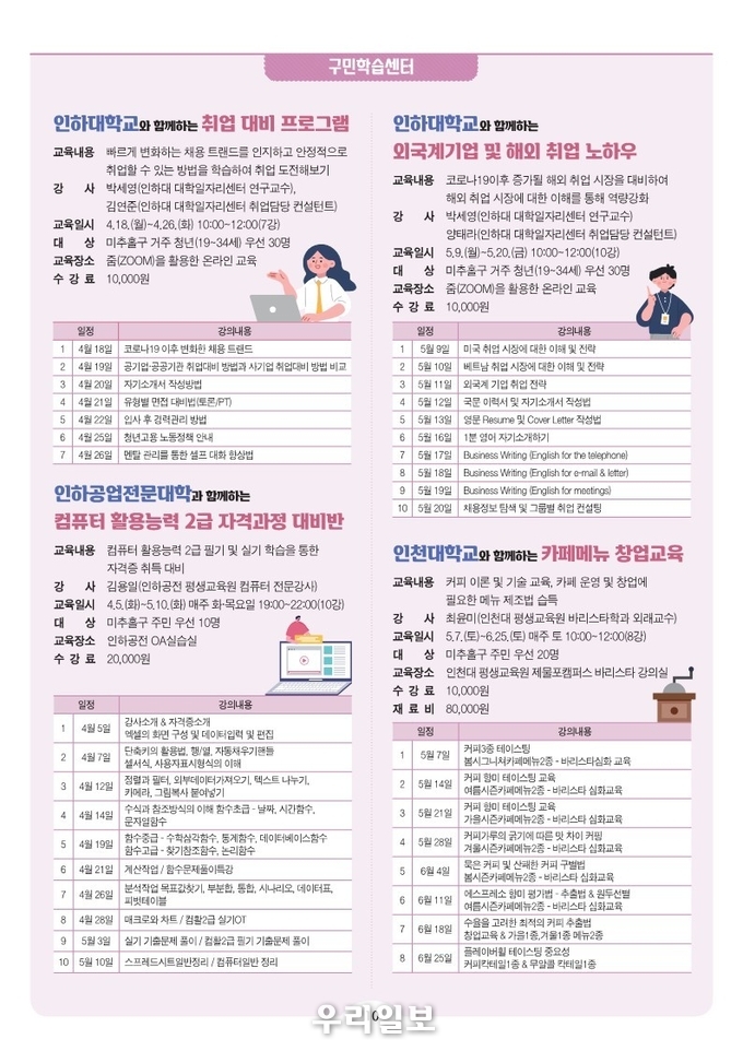 인하공업전문대학과 함께하는 프로그램은 컴퓨터 활용능력 2급 자격과정 대비반으로 취업을 준비하는 학생 및 주민들에게 컴퓨터 자격증 취득을 위한 기회를 제공한다.
