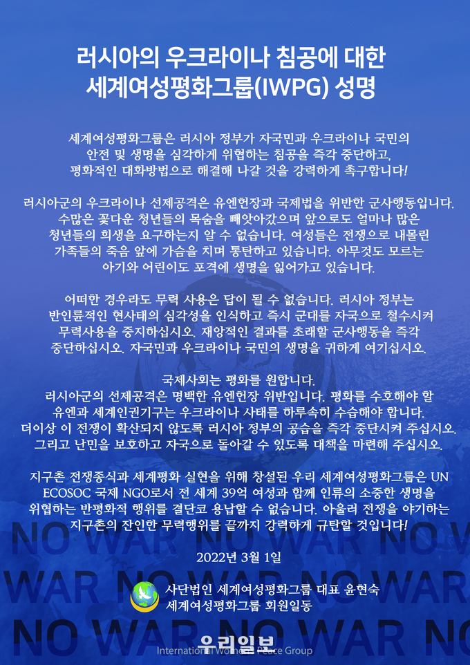 ㈔세계여성평화그룹(IWPG, 대표 윤현숙)이 지난 1일 러시아의 우크라이나 침공에 대한 우려를 표하고 우크라이나 사태와 관련해평화적 방법으로 해결해 나갈 것을촉구하는 성명을 발표했다.