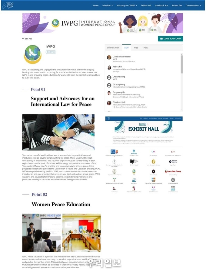 IWPG는 지난 16일에 병렬행사(Parallel Event)를 시작으로 17일 코트디부아르 여성가족아동부와 사이드 이벤트를 공동 주최했으며 전 세계 여성들과 교류하는 ‘가상박람회’(Virtual Forum)도 2주간 열었다.