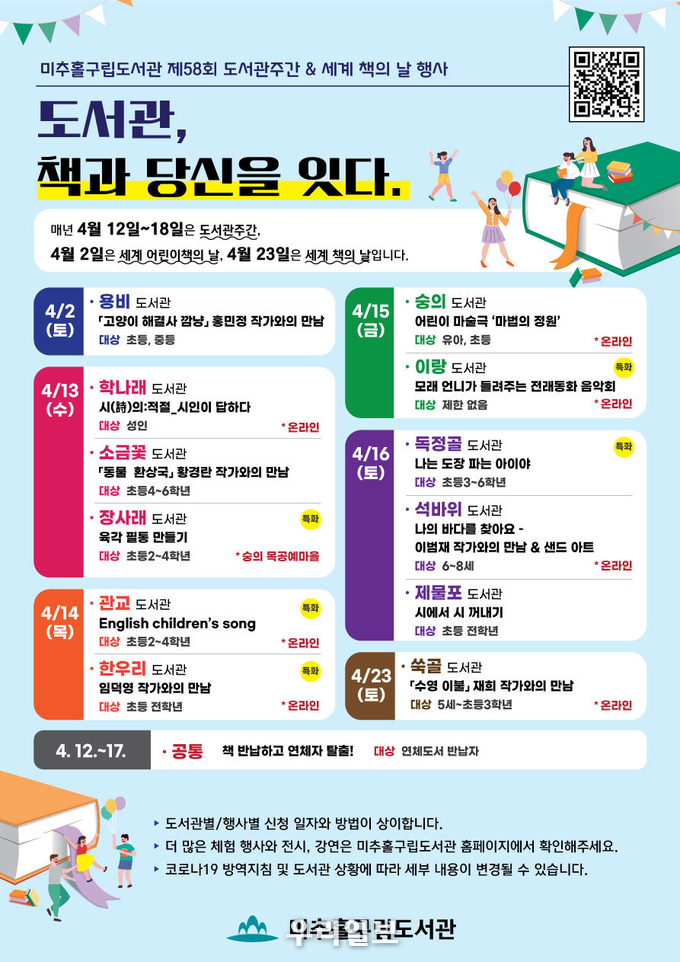 이 밖에 체험 행사와 전시, 특강, 공연은 미추홀구립도서관 홈페이지에서 확인할 수 있다.