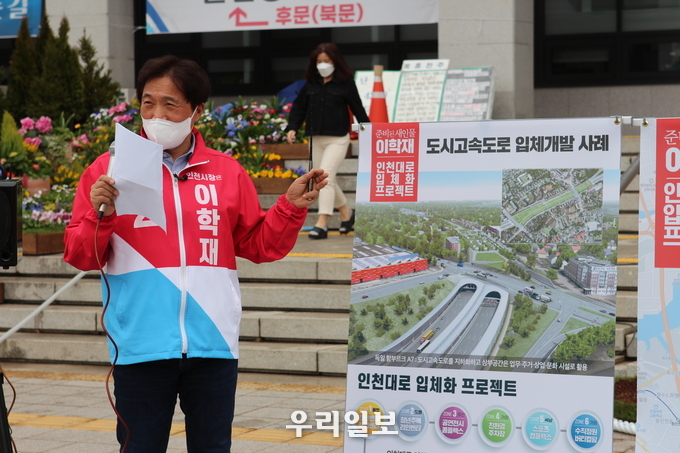 국민의힘 이학재 인천시장 예비후보가 30일 인천시청 본관 앞에서 기자회견을 통해 “인천대로 입체화 프로젝트를 완성하여 대한민국 원도심 재생의 랜드마크로 조성하겠다”고 공약을 발표했다.