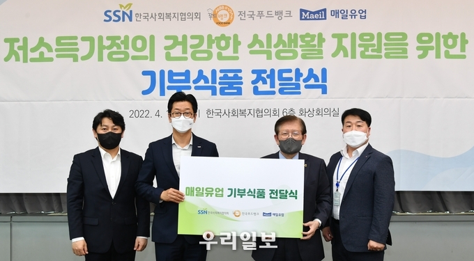 한국사회복지협의회 전국푸드뱅크(회장 서상목)와 매일유업(대표이사 김선희)은 지난 7일 서울 마포구 사회복지회관에서 저소득가정의 건강한 식생활 지원을 위한 기부식품 전달식을 가졌다.