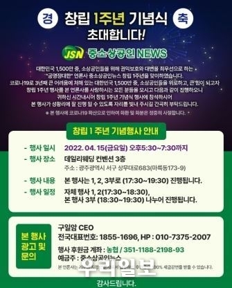 중소상공인뉴스(대표이사/발행인 이기성)은 대한민국 1,500만 중.소상공인을 대변하는 공익언론으로서 공명정대한 중.소상공 언론사로 오는 4월 15일 오후 5시 30분 부터 광주데일리 웨딩컨벤션 3층에서 창립 1주년 기념식 행사를 개최한다고 밝혔다.