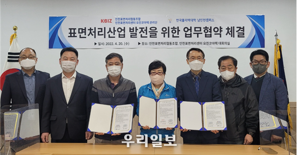 한국폴리텍대학 남인천캠퍼스(학장 허재권)와 인천표면처리공업협동조합(이사장 윤승남), 인천표면처리센타 요진코아텍관리단(회장 이영규)은 지난 20일 인천표면처리조합 대회의실에서 표면처리산업 발전을 위한 상호 협력을 위한 MOU를 체결했다.