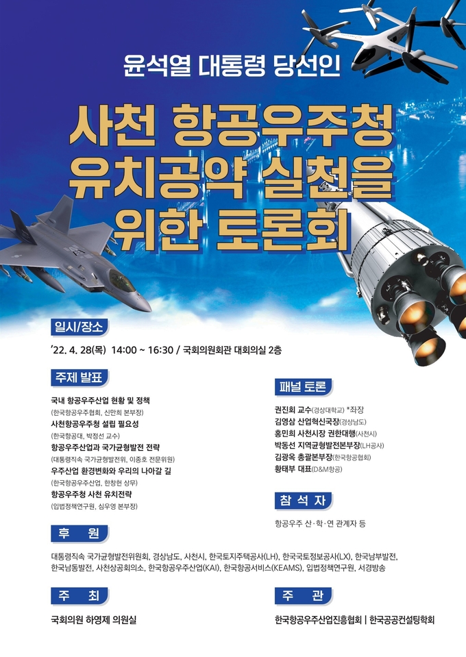 국민의힘 하영제 의원(경남 사천.남해.하동)은 28일(목) 오후 2시 여의도 국회의원회관 대회의실에서 「윤석열 대통령 당선인 항공우주청 사천 유치공약 실천을 위한 토론회」를 주최한다. 이 날 토론회에는 국민의힘 이준석 당대표, 김기현 前 원내대표를 비롯하여 항공우주 산.학.연 관계자 등 300여 명이 참석할 예정이다.