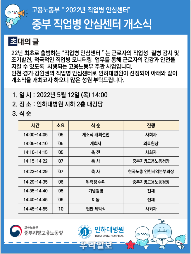 중부지방고용노동청(청장 이명로)과 인하대학교의과대학부속병원(원장 김영모), 원주세브란스기독병원(원장 백순구)은 12일 오후 2시에 인하대학교의과대학부속병원에서 ‘중부 직업병 안심센터’ 개소식을 개최한다고 밝혔다.