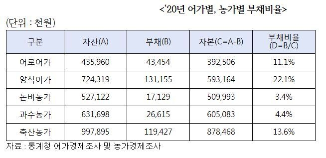 통계청에서 발표한 ‘2020년 농가 및 어가경제조사’에 따르면, 양식어가는 어로어가에 비하여 소득은 2배 높지만 부채는 3배가 높은 것으로 나타났다.