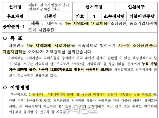 그런데 김종인 후보가 선관위에 제출한 공약 1순위 지역화폐 ‘서로e음’ 이행방법에는 현재 서로e음 캐시백 10% 혜택을 예산범위까지 당분간 지속하는 것을 목표로 한다고 명시돼 있다.