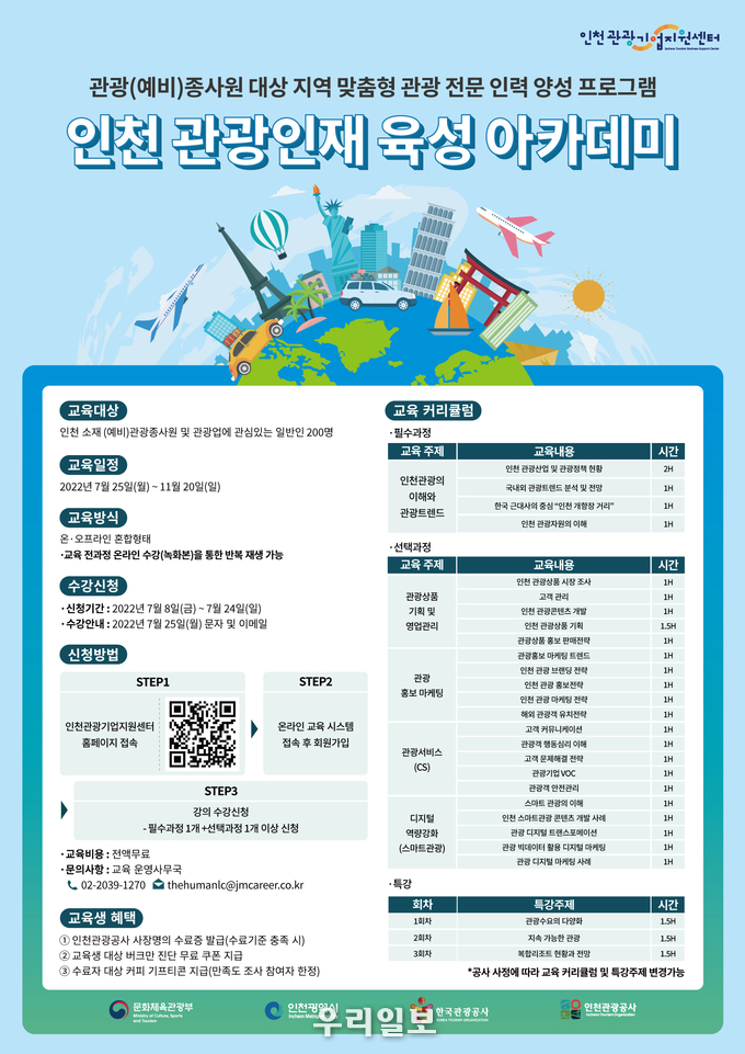 인천 관광인재 육성 아카데미는 인천권의 특수성과 관광 정책 변화를 반영한 총 5개 과정 24개 관광 특화 교육으로 구성된다.