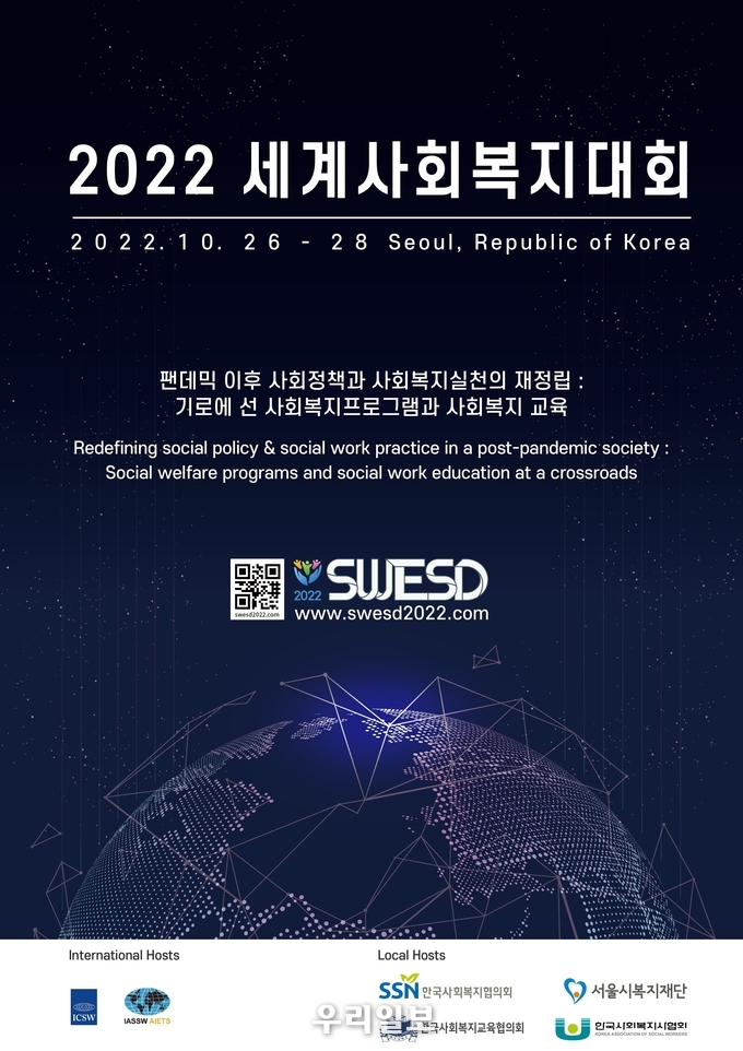 전 세계 사회복지인의 축제인‘2022 세계사회복지대회’가 오는 10월 26일부터 28일까지 서울가든호텔 그랜드볼룸에서 ‘팬데믹 이후 사회정책과 사회복지실천의 재정립; 기로에 선 사회복지프로그램과 사회복지 교육’이라는 주제로 개최된다.