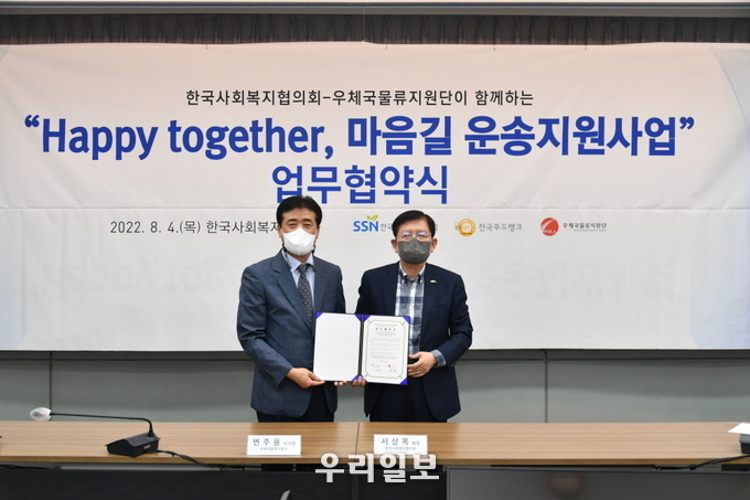 한국사회복지협의회(회장 서상목)와 우체국물류지원단(이사장 변주용)는 4일 한국사회복지회관(서울 마포구 소재)에서 ‘Happy together, 마음길 운송지원사업’운영을 위한 업무협약을 체결했다.