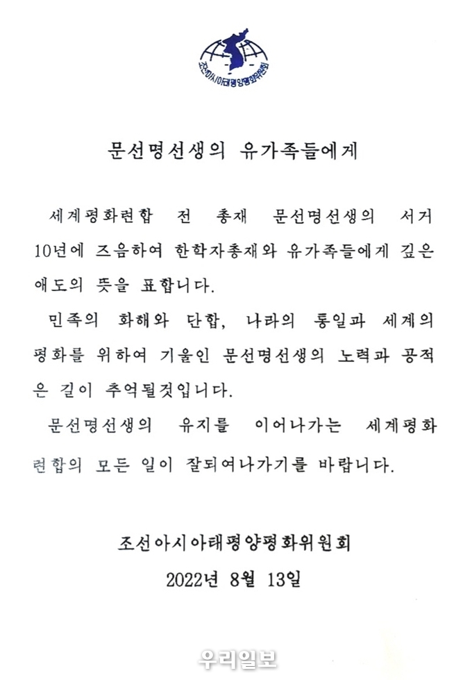 이날 문선명 총재 천주성화 10주년을 맞아 북한의 조선아시아태평양평화위원회(이하 아태위원회) 이름으로 한학자 총재와 유가족에게 조전과 조화를 보내와 눈길을 끌었다.