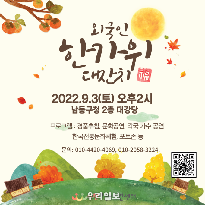 인천외국인지원센터 장영숙 센터장은 “삼삼오오 방문하는 외국분들이 ‘한가위 대잔치’를 통해 고향의 그리움을 달래는 시간이 되고 이 프로그램에 함께하는 동안 행복하고 뜻깊은 추억이 될 것”이라며 아울러 “다양한 경품도 준비돼 있다”고 덧붙였다.