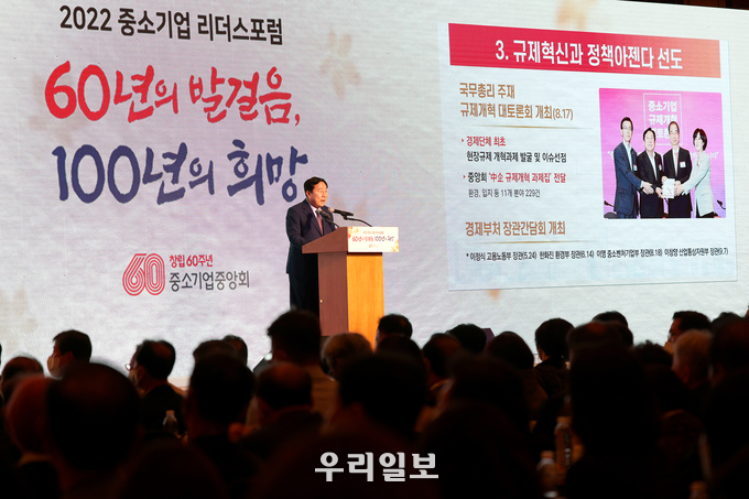김기문 중기중앙회장은 개회사를 통해 “대한민국은 글로벌 공급망이 재편되는 상황에서도 국제적으로 납기를 가장 잘 지키는 나라가 됐고 중소기업은 코로나 팬데믹에도 수출과 일자리를 만들어가며 경제성장을 이끌어왔다”며 “과거 60년을 발판 삼아 새로운 100년을 준비하자”고 강조했다.