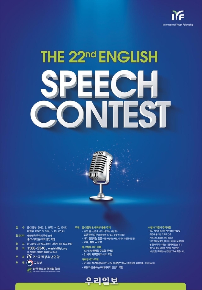 국제청소년연합(IYF)이 주최하고 교육부와 서울시, 한국청소년단체협의회 등이 후원하는 제22회 IYF 영어말하기대회가 오는 15일(중‧고등부)과 22일(대학부)까지 원고를 접수한다.