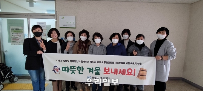 굿월드인터내셔널은 지난달 31일 만수동 휴먼시아2단지 향촌경로당을 방문해 레크레이션과 유익한 강연을 들려줄 뿐 아니라 직접 뜬 목도리를 어르신들께 전달했다.